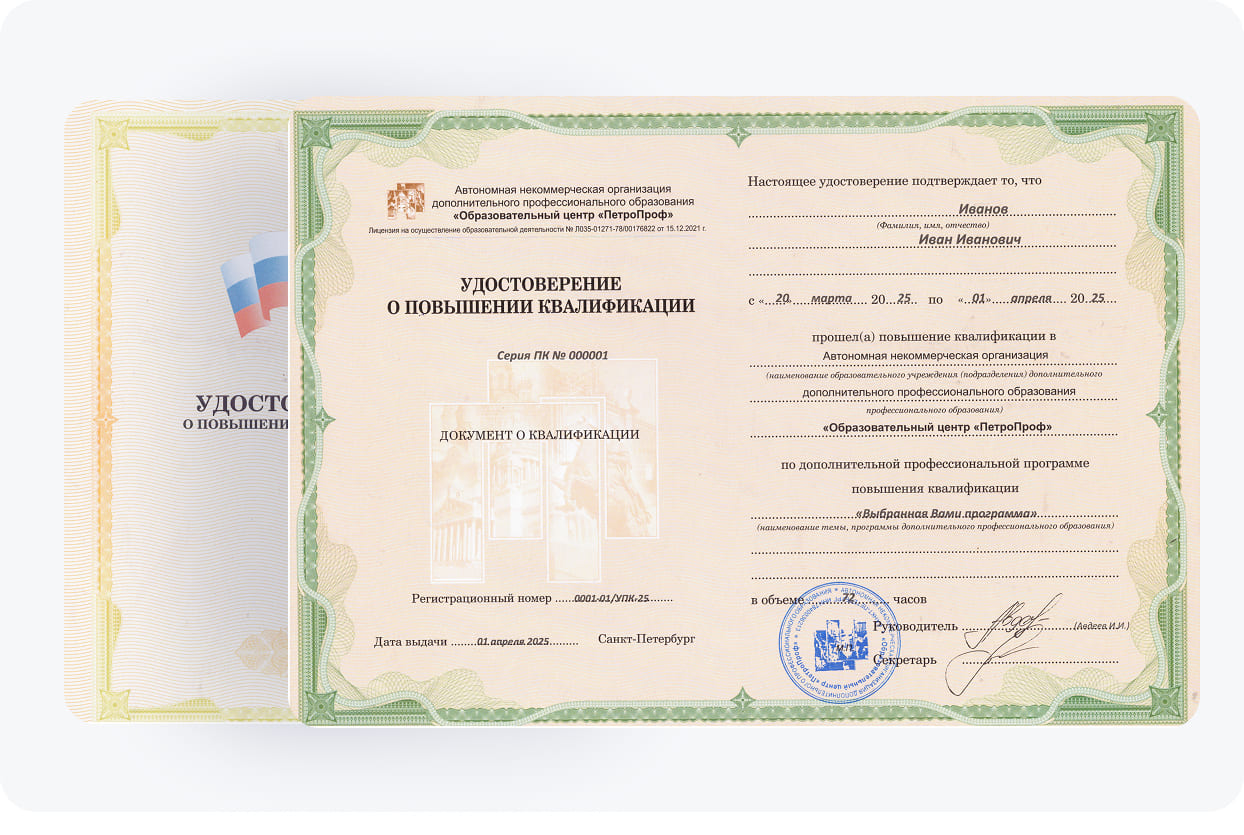 В нашем образовательном центре применяются эффективные программы повышения квалификации, разработанные с учетом установленных стандартов. Они отличаются структурированным материалом и понятными доступными темами. Также студенты проходят практические занятия под руководством наших педагогов. Затем им выдается удостоверение о повышении квалификации, которое потребуется при трудоустройстве.